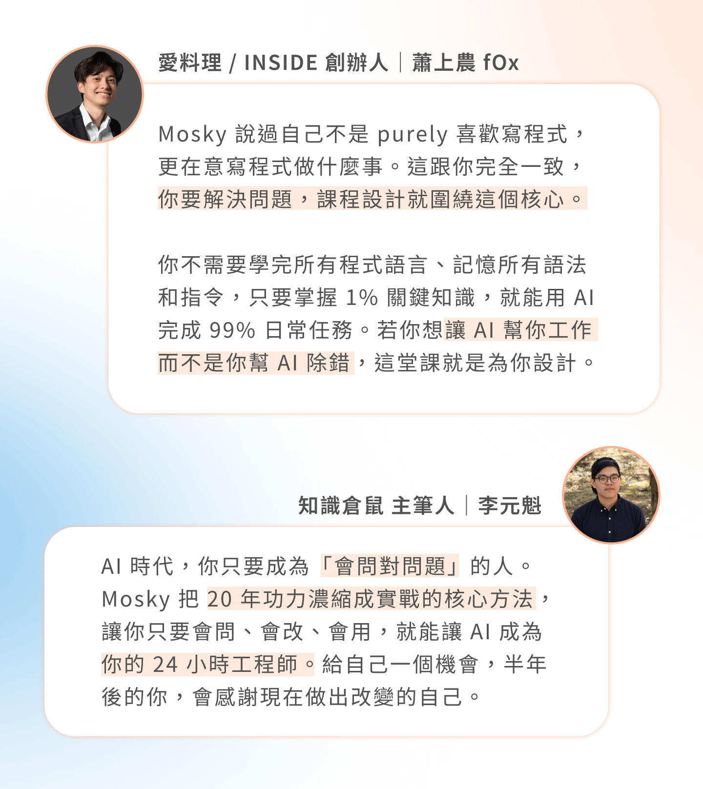 新手知識缺口,就用 1% 關鍵知識來補! 20 年資深軟體工程師 Mosky 帶你用輕鬆、安全、可控的方法,寫出自己的 App、爬蟲、自動化小工具。系統化知識搭配實戰案例,不是盲從 AI,而是掌握邏輯,讓 AI 成為你的能力放大器!